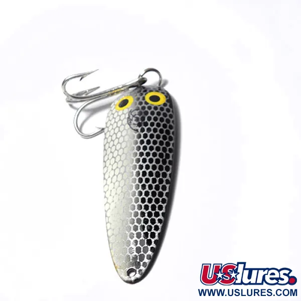 Ця масивна блешня-коливалка вагою 28 г (1 унція) є класичним зразком американської рибальської історії. Корпус завдовжки 9 см (3 1/2") має сріблясте покриття з чорним візерунком у формі стільників та двома виразними жовтими очима — це забарвлення відоме як Natural. На звороті чітко видно глибоке клеймо «DARDEVLE DETROIT USA», що свідчить про виробництво компанією Eppinger ще до їхнього переїзду в Дірборн у 1959 році. Даний екземпляр (артикул 0243) перебуває у відмінному стані (5/5) і має характерну увігнуту форму, отриману завдяки використанню фірмових заводських штампів. Оснащення складається з потужного трійника та посиленого заводного кільця. Конструкція з товстого металу дозволяє виконувати дальні закиди та стабільно тримати горизонт на рівномірній проводці, під час якої приманка демонструє впевнену гру з характерними коливаннями.