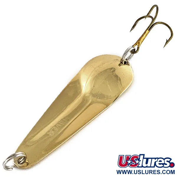 Ця золотиста блешня довжиною 7 см (2 3/4") має багату історію, що сягає початку 1930-х років. На її внутрішньому боці чітко викарбувано назву «HAVER». Цей екземпляр вагою 14 г (1/2 унції) є втіленням розробки Персі Хавера, створеної у 1932–1933 роках. Модель James Aitken Haver (артикул 17420) має класичний краплеподібний профіль із полірованим золотистим покриттям, яке зберігає блиск по всій поверхні. Конструкція включає міцне заводне кільце в носовій частині та бронзований трійник у хвостовій частині. Приманка виготовлена в США і перебуває в ідеальному стані (5/5): фурнітура чиста, а покриття повністю збережене. Металеве тіло має вивірену форму з глибоким вигином, призначеним для лову в закид та тролінгу.