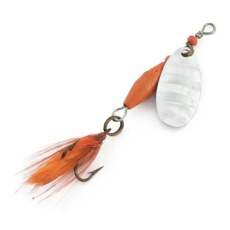 Маркування, чітко викарбуване на сріблястій пелюстці, ідентифікує цей конкретний екземпляр Abu Garcia Spinnaren Reflex як добре збережений зразок. Обертова блешня вагою 1/8 унції (4 г) побудована на базі нікелевої пелюстки з виштампуваними заглибленнями, що забезпечує стабільне виблискування. Яскраво-помаранчеве тіло доповнює відповідне помаранчеве пір'я на трійнику, що додає об'єму профілю довжиною 2 дюйми (5 см). Червоні пластикові намистини на дротяному каркасі виконують роль підшипників, полегшуючи обертання хомутика під час проводки. Приманка зареєстрована під артикулом 24622 і має оцінку стану 5/5 із повною цілісністю всіх компонентів.