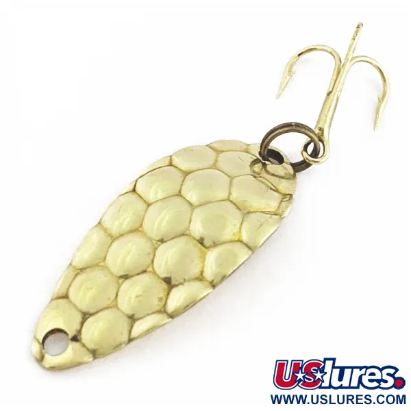Карбована поверхня цієї блешні-коливалки із золотим покриттям створює характерну текстуру «bubbles», що вловлює та розсіює відблиски світла в усіх напрямках. При вазі 1/8 унції (3,5 г) компактний корпус довжиною 1 1/4 дюйма (3 см) створює силует, що імітує дрібного малька. Золоте покриття залишається ідеально чистим на рифленій поверхні, що свідчить про високу якість заводської обробки. Класичний краплеподібний силует вирізняється виразним вигином у задній частині, що надає приманці достатньої ваги для ефективної гри. Цей екземпляр отримав оцінку 5/5 за винятково збережений зовнішній вигляд. Виріб під кодом 24558 виділяється рівномірним візерунком заглиблень на опуклому боці.