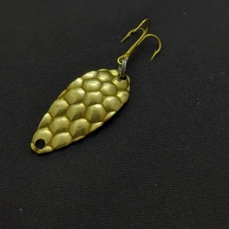 Текстурований візерунок у формі бульбашок на опуклій стороні цієї золотої блешні довжиною 1 1/4" (3 см) створює особливий візуальний ефект при закиданні на легку снасть. При вазі 1/8 oz (3.5 г), ця Acme Little Cleo має штамповану поверхню у вигляді луски, яка ловить і відбиває світло. Зворотний бік блешні гладкий, з вибитим на металі ім'ям виробника. Артикул 24586, стан 5/5. Позаду встановлений трійник золотистого кольору, що доповнює металевий вигляд корпусу.