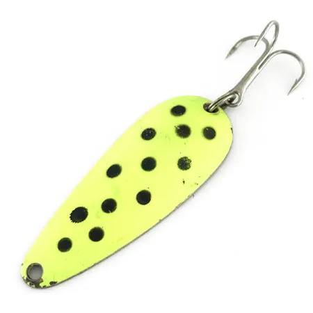 На бронзовому звороті цієї металевої коливалки вагою 1/3 унції (9 г) чітко викарбовано класичне маркування Blue Fox та країну походження — USA. Ця блешня Aqua Spoon довжиною 5,5 см (2 1/4 дюйма) має артикул 9525 та вирізняється яскраво-салатовою (шартрез) лицьовою стороною, прикрашеною тринадцятьма чорними точками. Стан приманки оцінюється як 4/5: помітні незначні сліди використання у вигляді потертостей фарби по краях, хоча сам метал і штампування зберегли чіткість. Конструкція оснащена міцним трійником на заводному кільці, що робить її надійним вибором як для закиду, так і для тролінгу за різних умов освітлення. Контраст між яскравим неоновим покриттям та металевою латунною підкладкою є характерною рисою дизайну бренду часів виробництва у США. Біля отвору для кріплення жилки витиснуто невеликий логотип у формі голови лисиці, що додає фінальний штрих автентичності для колекціонерів вінтажних снастей.