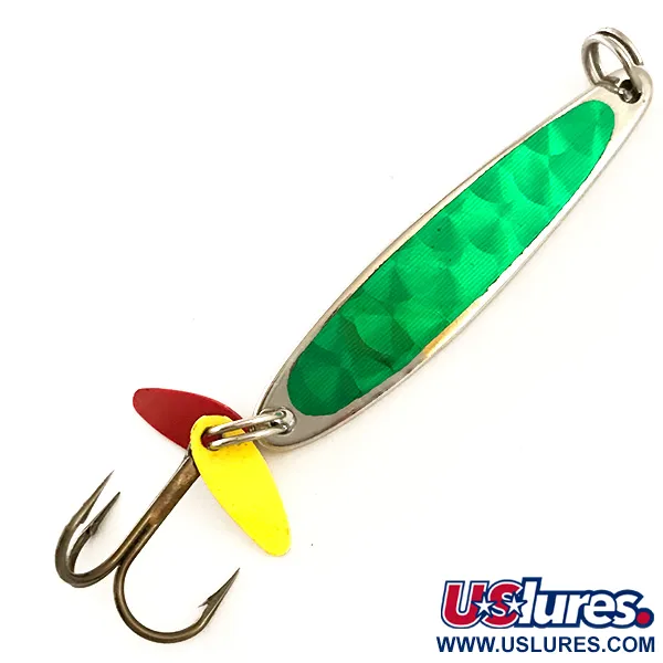 Нікелеве покриття слугує основою для цієї класичної приманки вагою 1/4 унції (7 г). На лицьовій стороні розміщена яскраво-зелена наклейка з призматичною текстурою, що створює характерні ромбоподібні відблиски. Завдяки довжині рівно 2 дюйми (5 см) ця модель є універсальною як для прямовисного блешніння, так і для лову в закид. У хвостовій частині встановлено міцний трійник із фірмовими пластиковими пелюстками червоного та жовтого кольорів, які створюють помітний контраст на фоні сріблястого корпусу. Виготовлена мічиганською компанією Bay de Noc, ця блешня втілює їхній багаторічний досвід у розробці ефективних приманок для зимової риболовлі та лову на відкритій воді. Стан оцінюється на 5/5: чисте нікелювання зі зворотного боку та відмінно збережена наклейка. Модель за каталогом №6359 завдяки важкій металевій конструкції швидко досягає зони клювання.