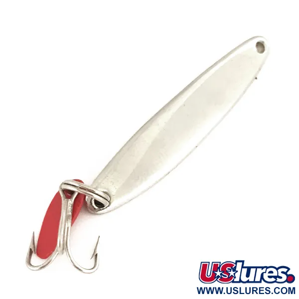 Ця блешня вирізняється яскравим нікелевим покриттям, що є характерною рисою ефективності Swedish Pimple в умовах слабкого освітлення. Виготовлена компанією Bay de Noc у США, вона важить 5,5 г (3/16 унції) при довжині 4,5 см (1 3/4 дюйма). Вузький профіль моделі 7445 став результатом понад столітньої еволюції дизайну; він забезпечує мінімальний опір води під час вертикального блешніння з льоду або закидань на течії. До нижнього заводного кільця прикріплена фірмова червона пластикова пелюстка, що створює помітний флуоресцентний акцент безпосередньо біля гострого трійника. Ця флуоресцентна деталь слугує точкою атаки для хижака на глибині. Цілісний металевий корпус виготовлений методом штампування та відполірований до сильного блиску; стан оцінено на 5/5, поверхня металу залишається ідеально чистою та сяючою. Саме цей розмір часто обирають рибалки для лову окуня та судака, а значна вага при компактних габаритах робить приманку придатною і для літнього глибоководного джигу. Простий отвір у верхній частині дозволяє прив’язувати волосінь напряму або через застібку, що забезпечує необхідний баланс блешні для правильної гри під час вертикальної проводки.