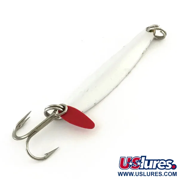 Перламутрово-біле покриття вузького металевого корпусу створює контрастний силует для риболовлі на великих глибинах. При вазі 9 г (1/3 унції) ця блешня Bay de Noc Swedish Pimple (артикул 8794) має довжину 4,5 см (1 3/4 дюйма). Фірмовий червоний пластиковий пелюсток на трійнику слугує яскравою точкою атаки, що провокує допитливу рибу на клювання. Час, проведений у коробці зі снастями, залишив невеликі сколи фарби по краях, що відповідає стану 4/5. Ця класична американська приманка є основою техніки прямовисного блисніння як для підлідної ловлі, так і для риболовлі по відкритій воді.