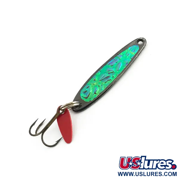 Передня частина цієї класичної вертикальної блешні оздоблена виразною зеленою голографічною лускою, що відблискує навіть у сутінках на глибині. При вазі всього 2 г (1/16 унції), ця Swedish Pimple від Bay de Noc є делікатним інструментом, створеним насамперед для лову окуня, форелі та дрібної риби. Металевий корпус має темне покриття кольору воронованої сталі на звороті та ребрах, що створює різкий контраст із яскравою вставкою «битий лід». Цей конкретний екземпляр з артикулом 8935 зберігся в ідеальному стані 5/5, демонструючи чіткі лінії та бездоганне покриття, притаманне виробам цього мічиганського виробника. Фірмова червона пластикова пелюстка закріплена на заводному кільці поруч із бронзовим трійником і слугує точкою атаки для цікавої риби. Вузький, злегка вигнутий профіль приманки є прямим спадкоємцем традиційних скандинавських вертикалок і призначений для прямовисної гри як з льоду, так і на глибоких ділянках відкритої води. Надійна фурнітура та вбудована пелюстка-подразник — незмінні атрибути цієї перевіреної часом моделі, яка вже десятиліттями є базовою в коробках багатьох рибалок.