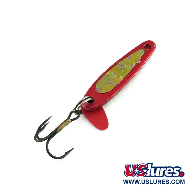 Передня частина цієї 2,5-сантиметрової (1 дюйм) блешні для прямовисного блешніння вкрита яскраво-червоною емаллю, яка виблискує на світлі разом із текстурованою голографічною наклейкою-призмою. Ця Bay de Noc Swedish Pimple (артикул 8936) важить 1/16 унції (2 г) і має характерний плаский профіль, що десятиліттями робить її невід’ємною частиною снастей мічиганського виробництва. Зі зворотного боку метал має чисте поліроване сріблясте покриття, що створює контрастний відблиск. Оснащення включає міцне заводне кільце, на якому тримається гострий трійник і маленька флуоресцентно-червона пластикова пелюстка, призначена для створення виразного візуального акценту під час вертикальної гри або закидання. Цей конкретний екземпляр перебуває у стані 5/5, зберігши початковий блиск та чіткі контури лакофарбового покриття й наклейок. Він втілює просту, але дієву філософію дизайну, характерну для продукції компанії з Гладстона, штат Мічиган.