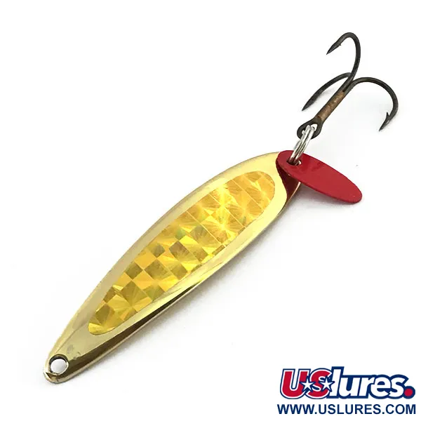 Солідна вага в 1/2 унції (14 г) при довжині корпусу 2 1/4" (5,5 см) дозволяє цій вертикальній блешні швидко заглиблюватися до робочого горизонту. Ця модель Swedish Pimple від Bay de Noc під артикулом 9053 має яскраве золотисте покриття, доповнене жовтою голографічною наклейкою «в клітинку», що створює багатогранні відблиски. У робочій частині встановлено міцний трійник разом із невеликою червоною пластиковою пелюсткою, яка слугує точкою атаки на тлі золотистого тіла приманки. Виготовлена в США, ця блешня має перевірену часом конструкцію, якій віддають перевагу багато поколінь рибалок, що полюють на глибоководного судака та форель як з льоду, так і по відкритій воді. Фурнітура та золотисте напилення знаходяться у відмінному стані, що відповідає оцінці 5/5. Акуратний отвір для кріплення волосіні розташований у звуженій частині, а на зворотному боці — гладка дзеркальна поверхня, характерна для цієї класики з Мічигану.