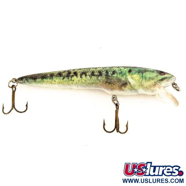 Цей Berkley Frenzy FWD4S загальною довжиною чотири дюйми (10 см) є чудовим зразком плаваючого мінноу з партії під артикулом 9597. Приманка важить 1/2 унції (14 г) і оснащена прозорою закругленою лопаттю, що забезпечує робочу глибину 1,2 м (3,9 фути). Її стан оцінюється на 5/5, при цьому фотореалістичне забарвлення під малька баса залишається яскравим і не має ознак зносу. Малюнок має темно-зелену спинку, що переходить у жовто-зелений бік з виразними темними плямами вздовж тіла, характерними для молодого баса. Фурнітура цього виготовленого в США виробу включає оригінальні трійники з темним покриттям та міцне носове заводне кільце. Berkley використали цю реалістичну естетику, щоб поєднати традиційні фарбовані приманки з сучасними покриттями високої чіткості. Пара темних нерухомих очей створює природний акцент у головній частині воблера.
