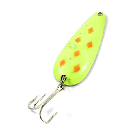 Лаймово-зелена фарба вкриває опуклу сторону цієї коливальної блешні вагою 1/3 унції (9,5 г), яку доповнює характерний візерунок із шести помаранчевих ромбів. За довжини 2 1/4 дюйма (5,5 см) цей примірник Blue Fox Aqua демонструє чіткі лінії та надійну конструкцію, притаманну виробам бренду періоду виробництва в США. Переверніть приманку, щоб побачити полірований сріблястий реверс із чітким глибоким штампуванням, що вказує назву моделі, вагу та країну походження. Стан 4/5 свідчить про добре збережений виріб із лише незначними ознаками віку, що гарантує яскравість неонового лаймового покриття на металевому тлі. Оснащення включає міцний трійник, закріплений за допомогою заводного кільця, а в носовій частині передбачено отвір для прямої прив'язки ліски або кріплення через застібку. Колекціонери вінтажних снастей Blue Fox, зокрема моделі 1951, часто шукають саме такий контраст кольорів через його відмінну помітність у різних умовах на воді.