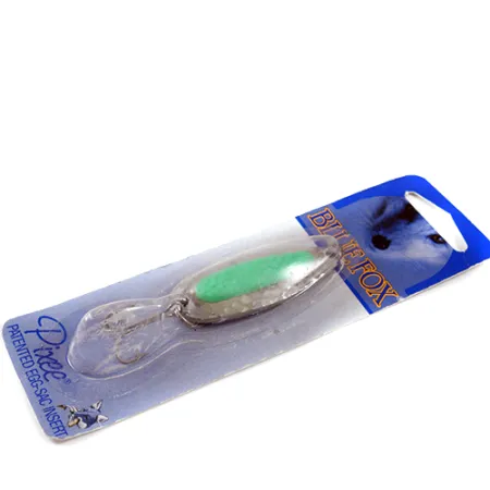 Вага 14 г (1/2 унції) та щільність товстостінної латунної блешні роблять її чудовим варіантом для далеких закидів навіть за сильного берегового вітру. Ця модель довжиною 5,5 см (2 1/4") має виразну текстуру «битий нікель» та яскраву зелену вставку, що імітує ікринку лосося. Такий конструктивний елемент є візитівкою серії Pixee, розробленої компанією National Expert Bait (Nebco) ще у 1960-х роках, до того як бренд перейшов у власність Blue Fox. Приманка з артикулом 1273 нова та пропонується в оригінальному вінтажному пакуванні. Оснащення включає міцний, стійкий до корозії трійник, з’єднаний з тілом блешні посиленим заводним кільцем. Завдяки своїй конструкції вона універсальна для річок, озер та моря, а важкий латунний корпус дозволяє стабільно тримати глибину на сильній течії. Оригінальна картонна упаковка повністю збережена, демонструючи класичне маркування Blue Fox часів американського виробництва.