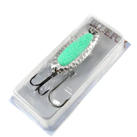 Кована нікелева поверхня створює складну гру багатогранних відблисків, що вигідно вирізняє цю товстостінну коливалку з-поміж гладких аналогів. При довжині 5,5 см (2 1/4 дюйма) та вазі 14 г (1/2 унції) ця блешня Blue Fox Pixee має артикул 1940 та оснащена зеленою фактурною пластиковою вставкою-ікринкою. Приманка перебуває в новому стані в оригінальній упаковці, яка містить як встановлений на заводі трійник Rapala VMC Black Nickel, так і додатковий одинарний гачок Siwash для різних варіантів оснащення. Цей екземпляр відповідає стандартам якості серії 2002 року з Міннетонки (Міннесота), де товстостінний латунний корпус був розроблений спеціально для далекого закидання та глибокого проведення на швидкій течії. Поєднання дзеркального металевого покриття та імітації лососевої ікринки робить цю модель легендарною серед рибалок, які полюють на лосося, стальноголового лосося та форель на Великих озерах та в Алясці. Конструкція приманки розрахована на тривале збереження покриття та цілісності корпусу навіть за корозійного впливу, характерного для різних умов риболовлі.