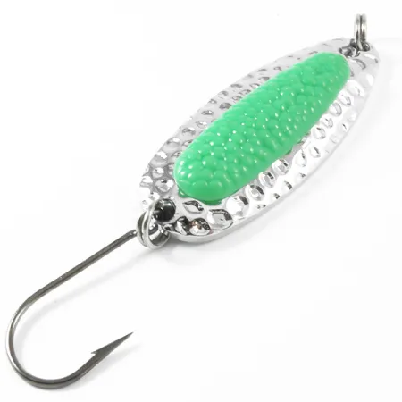 Масивний латунний корпус вагою 1/2 унції (14 г) слугує основою цієї класичної блешні для закидання та тролінгу. Фактурне покриття «битий нікель» доповнене яскравою зеленою вставкою, що імітує ікринку лосося — характерна деталь, покликана провокувати на атаку лососевих та інших хижаків. При довжині 2 1/4 дюйма (5,5 см) приманка знаходиться у стані нової, без жодних слідів зносу на металевих поверхнях чи гачку. На звороті блешні чітко вибито логотип Blue Fox та напис «USA», що свідчить про її випуск у період після переходу бренду від оригінальної компанії Nebco. Для ідентифікації на наклейці зі зворотного боку вказано артикул 3314. Вага приманки дозволяє ефективно обловлювати вири на швидкій течії або досягати великої дистанції при закиданні проти прибережного вітру. Оснащення складається з потужного одинарного гачка, розрахованого на надійне підсікання та тривалу службу.