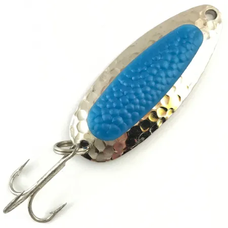 Карбоване нікелеве покриття забезпечує неймовірну кількість відблисків під водою, і ця модель вагою 14 г є класичним прикладом такої фактурної майстерності. У центр корпусу з товстої латуні вмонтовано яскраво-блакитну пластикову вставку, що імітує ікринку лосося — це фірмова особливість, яка зробила Pixee легендарним вибором для лову лосося та сталеголового пструга. Блешня має довжину 5,5 см, артикул 4475 і повністю зберегла оригінальне якісне напилення. Фурнітура складається з міцного заводного кільця та гострого трійника; усі елементи у відмінному стані з оцінкою 5/5. Завдяки співвідношенню ваги та розміру приманка ідеально підходить для дальніх закидів проти прибережного вітру або для облову потужної річкової течії, де тримається глибоководна хижа риба. Blue Fox, що згодом стала важливою частиною родини Rapala, вдосконалила цю конструкцію для різних технік, включаючи рівномірний озерний тролінг або хаотичну гру з перекатами у стрімких потоках. Контраст між холодною блакитною вставкою та блискучим металом створює чіткий силует, помітний навіть у каламутній воді.