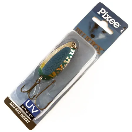Ця приманка, оснащена унікальною синьою УФ-вставкою у формі ікринки, є спеціалізованим інструментом для лову лосося, мікіжі та форелі. Блешня-коливалка Blue Fox Pixee (артикул 4748) має масивний латунний корпус вагою 14 г (1/2 унції) та довжиною 5,5 см (2 1/4 дюйма). Поверхня кольору «кований нікель» створює різноспрямовані відблиски, що імітують блиск луски малька. Вона оснащена гачками VMC кольору «чорний нікель» від Rapala, які забезпечують надійну міцність для силової ловлі як у прісній, так і в солоній воді. Приманка нова і зберігається в оригінальній блістерній упаковці серії «Cover the Water». Технічні характеристики на звороті підкреслюють переваги важкої металевої конструкції, яка допомагає виконувати дальні закиди та тримати горизонт при глибоководній проводці. На упаковці також зазначено, що в комплект входить додатковий гачок типу «сайваш» для більшої універсальності залежно від правил рибальства чи особистих вподобань.