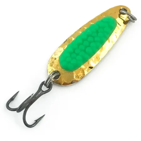 Текстура «бите золото» на поверхні цієї блешні завдовжки 3,5 см відбиває світло, створюючи виразні відблиски разом із яскраво-зеленою вставкою, що імітує ікринку лосося. Ця модель Pixee під артикулом 5577 важить 4,5 г і має корпус із товстої латуні, що допомагає виконувати далекі та стабільні закиди. Зелена пластикова серцевина є флуоресцентною та має властивість світитися в ультрафіолеті, що робить приманку помітнішою на глибині або в каламутній воді. Стан приманки оцінюється на 4 з 5: помітні незначні сліди часу, проте вона повністю зберігає цілісність конструкції та яскраве покриття. Спочатку розроблена компанією National Expert Bait, а згодом включена до лінійки Blue Fox, ця блешня є універсальною як для прісноводних річок, так і для прибережних морських вод. Вона оснащена трійником із темним покриттям, закріпленим на заводному кільці у хвостовій частині, що робить її надійним вибором для полювання на таких риб, як стальноголовий лосось, сьомга чи форель.