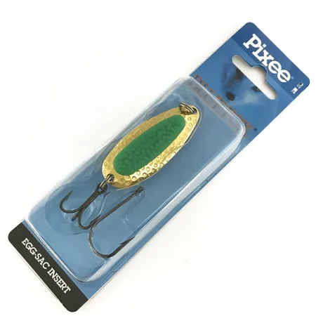 Важкий латунний корпус цієї блешні вагою 14 г (1/2 унції) має покриття з 24-каратного золота з карбованою поверхнею, що забезпечує необхідну вагу для далекого закидання при прибережному вітрі або для облову глибоких річкових ям. Ця Blue Fox Pixee (артикул 6920) оснащена класичною фактурною зеленою вставкою, що імітує ікряний мішок; вона розроблена для імітації натуральної ікри та провокування на атаку лосося, мікіжі та форелі. При довжині 5,5 см (2 1/4 дюйма) приманка має заводське оснащення трійником Rapala VMC кольору «чорний нікель», а в оригінальну упаковку додано запасний одинарний гачок (сайваш) для використання на водоймах, де дозволені лише одинарні гачки. Ця блешня, чия історія починалася ще з компанії National Expert Bait Co., перш ніж стати класикою лінійки Blue Fox, не була у використанні та залишається в оригінальному блістері, що має незначні ознаки зносу на кутах картонної підкладки. (Стан: 6, нова).