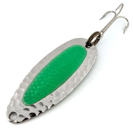 Карбоване нікелеве покриття вкриває товстостінний латунний корпус вагою 14 г (1/2 унції), що дозволяє цій коливалці швидко занурюватися в зону атаки. При довжині 5,5 см (2 1/4 дюйма) приманка має яскраву зелену текстуровану вставку, розроблену для імітації ікри лосося. Цей екземпляр з артикулом 15719 виготовлений із застосуванням UV-технології: середина інтенсивно світиться неоном при зниженні рівня освітленості, що слугує візуальним подразником на глибині або в каламутній воді. Розрахована на далеке закидання, міцна конструкція дозволяє облавлювати віддалені точки на великих річках або пробивати зустрічний береговий вітер. Оригінальна фурнітура, зокрема надійний трійник та заводне кільце, збережена в новому стані. Ця блешня від Blue Fox продовжує традицію важких моделей, що вперше стали популярними завдяки National Expert Bait у 1960-х роках. Колірна гама Nickel / Green є базовою для лову сталеголового лосося та інших лососевих, поєднуючи інтенсивне відблискування покриття з добре помітним осердям.