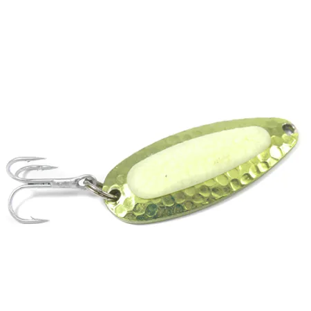 Завдяки корпусу з кованої латуні ця блешня вагою 14 г (1/2 унції) має класичну фактуру, що ефективно відбиває світло на різних глибинах. При довжині 5,5 см (2 1/4 дюйма) ця Blue Fox Pixee UV має артикул 2206 і є втіленням легендарного дизайну, який перейшов від компанії National Expert Bait до бренду Blue Fox у 1980-х роках. Покриття Green Gold доповнене яскравою флуоресцентною жовтою вставкою, що імітує ікринку лосося — вона світиться в ультрафіолеті, привертаючи увагу сталеголового лосося та сьомги в темній воді. Ця модель з оцінкою стану 4/5 зберігла якісне покриття та надійну фурнітуру. Її масивний корпус спеціально розроблений для далеких закидів проти прибережного вітру або для облову глибоких річкових вирв, де легші приманки просто зносить течією. Ця модель демонструє активну гру з ривками, коливаннями та переворотами, що робить її надійним вибором як для рівномірної проводки у солоній воді, так і для активної анімації вудилищем в умовах озер. Важка латунна конструкція забезпечує швидке занурення, дозволяючи дістати трофейну рибу, що стоїть біля самого дна.