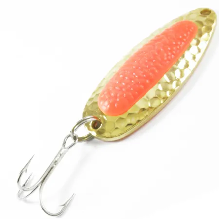 Карбована золотиста поверхня на важкому латунному корпусі — це класика для ловлі на глибині, і Blue Fox Pixee UV не є винятком. При вазі 14 г (1/2 унції) та довжині 5,5 см (2 1/4 дюйма) вона оснащена рельєфною помаранчево-червоною вставкою, що імітує купку лососевої ікри. Цей конкретний екземпляр з артикулом 3315 не був у використанні та зберіг свій первісний блиск (стан оцінюється на 6). Викарбуваний на зворотному боці напис «Blue Fox Pixee Pat. Pend. USA» підкреслює її репутацію надійного інструмента для річкової течії та прибережного вітру. Оскільки вставка є флуоресцентною, вона яскраво реагує на ультрафіолетове світло — ця особливість покликана провокувати на атаку щуку, лосося та стальноголового лосося. Конструкція блешні дозволяє проводити її як на мілководді, так і на глибині завдяки поєднанню ривків, активних коливань та осьових перекатів. Вона укомплектована стандартним трійником і міцним заводним кільцем, що гарантує надійність, за яку ці блешні так полюбилися мисливцям за трофеями.