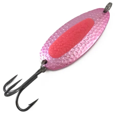 Ця рожева металева коливалка з рифленою поверхнею завдовжки 6,5 см (2 1/2") є базовим елементом арсеналу для серйозного лову лосося та стальноголового лосося. На гладкому зворотному боці викарбувано назву «Blue Fox PIXEE» та маркування ваги 7/8; ця модель за каталогом (код 4879) відповідає вазі 3/4 унції (24 г). Корпус із товстої латуні забезпечує необхідну масу для далеких закидів проти прибережного вітру або для облову глибоких річкових ям, де стоїть трофейна риба. Ключовою особливістю є яскрава червона вставка, що імітує ікринку лосося — вона вмонтована в рифлену поверхню і слугує точкою прицілювання. Цей флуоресцентний варіант з UV-ефектом особливо ефективний в умовах слабкого освітлення або в каламутній воді, де покриття Hammered Pink Metallic / Red зберігає видимість на великій глибині. Стан виробу — ідеальний (5/5), металеве покриття та чорний трійник у відмінному стані. Створена на основі розробок National Expert Bait (Nebco), ця модель Blue Fox розрахована на тривале використання як у прісній, так і в солоній воді. Її рекомендується використовувати із застібкою-вертлюжком, що дозволяє блешні хаотично грати та перекидатися у товщі води при віддачі шнура під час проводки.