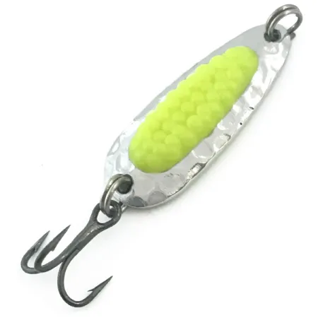 Покриття «карбований нікель» надає латунному тілу цієї блешні вагою 4,5 г (3/16 унції) виразну текстуру, що забезпечує привабливі відблиски за будь-якої прозорості води. При довжині 3,5 см (1 1/2 дюйма), Pixee вирізняється унікальною флуоресцентною жовтою вставкою, що імітує ікринки лосося. Цей конкретний екземпляр з артикулом 5576 перебуває у відмінному стані (5/5), має чисту поверхню та доглянуту фурнітуру. Світлонакопичувальні властивості жовтої вставки покращують видимість в ультрафіолеті, забезпечуючи перевагу під час лову в каламутній воді або в умовах слабкого освітлення. Ці важкі латунні приманки, які були основною продукцією National Expert Bait (Nebco) ще до епохи Blue Fox, добре збалансовані для далекого закидання і легко пробивають береговий вітер. У воді блешня демонструє хаотичні кидки, коливання та перекати, що дозволяє їй природно звалюватися в річкові приямки при лові біля дна. Міцний трійник із темним покриттям встановлений у хвостовій частині, а заводне кільце на носі готове до з’єднання з вертлюгом та застібкою.