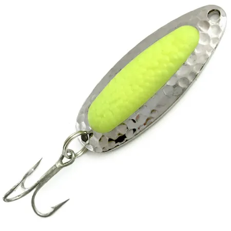 Карбована нікельована поверхня, що імітує луску, виблискує на сонці на масивному латунному корпусі цієї блешні вагою 14 г (1/2 унції). Ця модель Blue Fox Pixee UV довжиною 5,5 см (2 1/4 дюйма) під кодом 5877 вирізняється характерною жовтою вставкою у формі лососевої ікринки, що має провокувати рибу на атаку. Даний екземпляр зберігся у стані 5/5, з чітким заводським клеймом «Blue Fox PIXEE PAT.», а також маркуванням ваги та логотипом бренду на полірованому зворотному боці. Жовта вставка є флуоресцентною та активно світиться в ультрафіолеті, що забезпечує видимість приманки на глибині чи в умовах слабкого освітлення. Розрахована на далекі закидання навіть при сильному прибережному вітрі, блешня оснащена надійним заводним кільцем та гострим трійником. Велика вага при компактному розмірі дозволяє ефективно обловлювати річкові ділянки з потужною течією, полюючи на лосося чи микижу, оскільки приманка стабільно грає, проходячи крізь глибокі ями та вири.