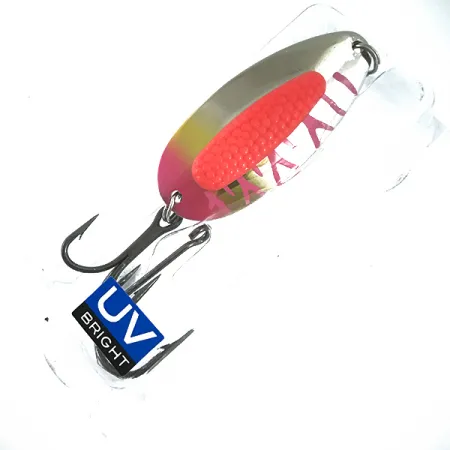 Нікелеве покриття вкриває важкий латунний корпус, забезпечуючи значну вагу, необхідну для далеких закидів проти прибережних вітрів або в глибокі річкові ями. При вазі 3/4 унції (24 г) та довжині 2 1/2 дюйма (6,5 см), ця Blue Fox Rattlin Pixee UV (код товару: 4576) є солідною приманкою. Характерна флуоресцентна рожева пластикова вставка розроблена для імітації ікри лосося — візуального подразника, який давно полюбляють рибалки на лосося та стальноголового пструга. Цей конкретний екземпляр має фінішне покриття UV Bright на металевій поверхні, призначене для покращення видимості у глибшій воді або в умовах недостатнього освітлення. Щодо оснащення, вона озброєна міцним трійником, прикріпленим за допомогою надійного заводного кільця. Приманка нова, виглядає так само, як і на момент виходу з заводу. Її масивна конструкція робить її надійним вибором для лову на сильних течіях річок, де важливо утримувати глибину. Позначення «Rattlin» стосується внутрішніх компонентів, покликаних додати акустичний елемент до гри приманки.