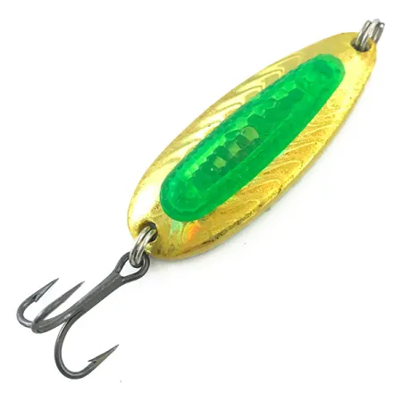 Ця важка латунна блешня вагою 1/4 унції (7 г) має унікальну форму, що зробило її базовою приманкою для лову лосося, сталеголового пструга та форелі. Корпус довжиною 2 дюйми (5 см) вирізняється яскравим покриттям Golden Herring з лицьового боку, яке доповнене фактурою «битий метал», що імітує натуральну луску. На зворотному боці блешні — чисте срібне покриття з логотипом Blue Fox та маркуванням 01-20R - 1/4 (артикул 5593). Головною особливістю моделі Rattlin Pixee UV є напівпрозора вставка Green UV, яка імітує лососеву ікринку та містить дрібні кульки для створення шумового ефекту. Цей конкретний екземпляр перебуває в ідеальному стані (оцінка 5/5), без жодних слідів зносу на покритті чи оригінальному трійнику темного кольору. Компактна та важка конструкція дозволяє працювати на глибині при сильній річковій течії або робити далекі закиди проти морського вітру.