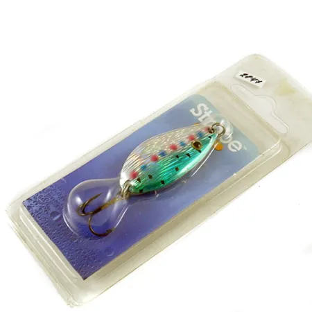 Забарвлення під райдужну форель цієї блешні Blue Fox Strobe поєднує яскраво-зелений відтінок із червоними та синіми цятками поверх лазерного голографічного покриття. При довжині 4,5 см та вазі 7 г, штампована латунна основа має хромоване напилення для забезпечення стійкого відблиску. На упаковці з артикулом 2847 зазначено, що ці блешні призначені як для лову в закид, так і для тролінгу. Цей конкретний примірник не був у використанні та залишається запакованим у фірмовий блістер, хоча на самій упаковці є незначні потертості від тривалого зберігання. Вона оснащена високоякісними гачками VMC — стандартом для Blue Fox Tackle Co. у період виробництва в Міннетоніці, штат Міннесота. Форма «крапля» має нанесений малюнок для створення максимально інтенсивних відблисків, а на звороті планшета підкреслено здатність приманки до хаотичних коливань та гри під час руху у воді.