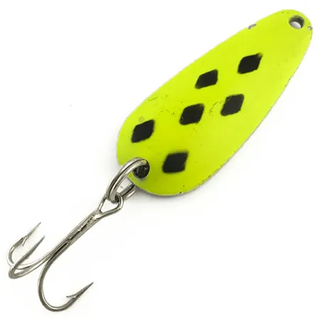 Класичний дизайн «П'ятірка бубнів» визначає вигляд цієї блешні Blue Fox Tor-P-Do UV, де п'ять чорних ромбів чітко нанесені на яскраво-жовту основу. Ця коливалка вагою 1/2 унції (14 г) має довжину 2 дюйми (5 см) та йде під артикулом 5786. На зворотному боці з нікелевим покриттям чітко виштампувано логотип Blue Fox та країну походження (USA), що підтверджує якість американського виробництва. Жовте покриття спеціально оброблене для надання йому УФ-активних властивостей, що покращує помітність приманки на глибині або в каламутній воді. Міцне заводне кільце з’єднує хвостовий отвір із якісним та гострим трійником. Стан оцінено на 5/5: екземпляр не має слідів використання, а фарба та штампування залишилися чіткими. Ця блешня для закидання та тролінгу залишається базовою снастю для рибалок, що полюють на хижака за будь-якої прозорості води.