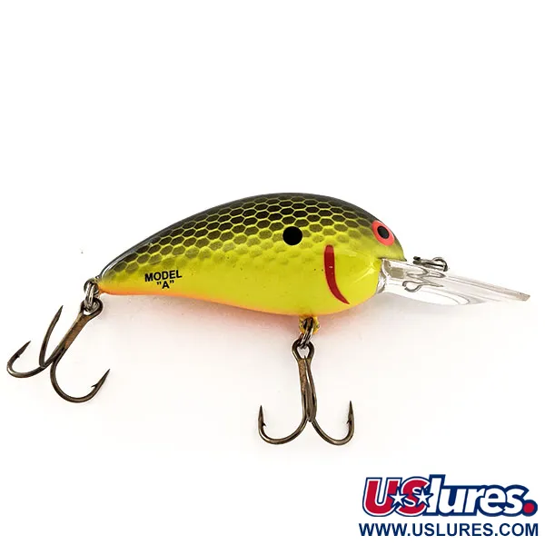 Луска з темним стільниковим візерунком плавно переходить у яскраво-шартрезні боки цього кренка довжиною 5,5 см (2 1/4"). Цей екземпляр Bomber B04A UV, який можна впізнати за класичним штампом моделі «A» та артикулом 11853, має спеціальне покриття, що світиться в ультрафіолеті. При вазі 8 г (1/4 oz) на корпусі виділяється чітка червона риска біля голови та яскраве червоне око. Прозора лопать розрахована на заглиблення від 0,9 до 2,1 м (3–7 футів), що робить приманку універсальним вибором як для лову в закид, так і для тролінгу. Приманка у відмінному стані (оцінка 5/5) та оснащена оригінальними трійниками бронзового кольору. Її властивість світитися особливо стає в пригоді при лові щуки чи судака в мутній воді або в сутінках.