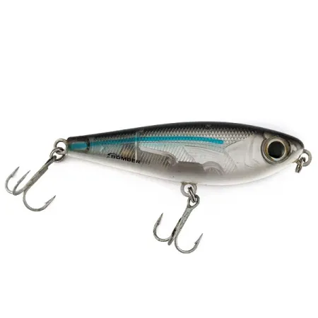 Виразна синя бічна смуга визначає зовнішній вигляд цієї напівпрозорої сріблястої поверхневої приманки. Розроблений для лову щуки та окуня, Bomber Badonk-A-Donk Low Pitch тримається на самій поверхні з робочим заглибленням 0 м. Цей екземпляр (артикул 19374) оснащений внутрішньою низькочастотною шумовою камерою, що вирізняє його з-поміж версій із вищим звуком. Конструкція корпусу має детальну фактуру луски вздовж темної спинки та велике реалістичне око із золотистою райдужкою. При довжині 10,16 см та вазі 21,26 г приманка має масивний профіль, зручний для закидання. Оснащена двома міцними трійниками, фурнітура гостра і не має ознак зносу. Ця приманка не використовувалася і перебуває у стані 5/5. Напівпрозорий корпус від Bomber м'яко пропускає світло крізь пластик під час проводки.