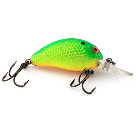 Флуоресцентно-жовто-зелене (FYG) покриття цього кренка вагою 1/4 унції (7 г) має характерний малюнок луски «соти» на округлому корпусі. Збережений у відмінному стані 5/5, цей екземпляр демонструє класичну американську якість серії Bomber Model A. При довжині 1 3/4" (4,5 см) цей плаваючий воблер розрахований на роботу на глибинах від 0,9 до 2,1 м (3–7 футів), що є універсальним рішенням для лову судака чи щуки. Контрастний дизайн доповнює яскраво-червоне око на фоні лаймової голови та прозора лопатка, вмонтована в носову частину. Модель під артикулом 19262 оснащена двома гострими трійниками на міцних заводних кільцях.