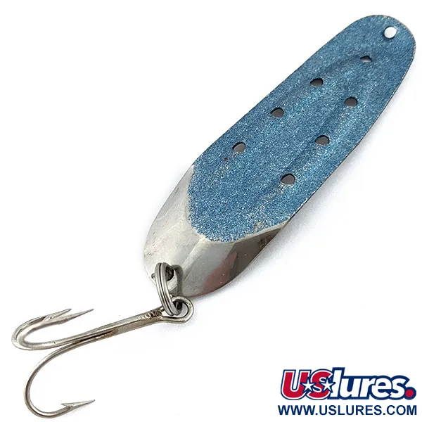 У тілі цієї 8-сантиметрової (3 1/4") блешні просвердлено вісім точних отворів — фірмове рішення Дж. Рустовича, розраховане на ловлю в закид та тролінг. На зворотному боці чітко вибито клеймо «© 1967 J. RUSTOWICZ» та вказано країну походження (США), що підтверджує автентичність цієї приманки як частини історії американських рибальських снастей з артикулом 18414. Метал виконаний у поєднанні нікелю та синього кольору, де на основну поверхню корпусу вагою 12,5 г (2/5 унції) нанесено великі сині блискітки. Хоча сучасні версії моделі Charger випускає компанія Lake Products, цей конкретний екземпляр зберігає оригінальні риси виробництва епохи Рустовича. Стан оцінюється на 5/5: блешня має чисте яскраве покриття та добре збережену фурнітуру, зокрема міцне заводне кільце та стандартний трійник.