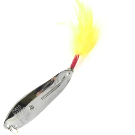 Поліроване нікелеве покриття цієї блешні завдовжки 6,5 см чудово грає на світлі, підкреслюючи її характерну конструкцію-незачіпляйку. При вазі 12,5 г блешня Crippled Alewive має незвичну будову зі спеціальним монтажним штифтом на внутрішній стороні тіла. Одинарний гачок захищений дротяним відбійником і оснащений яскраво-жовтою мушкою з пір’я, яка закріплена щільною обмоткою червоною ниткою біля вушка. На увігнутому боці металу чітко видно викарбувану назву «CRIPPLED ALEWIVE» та країну походження США — ознаку американського виробництва середини минулого століття. Цей конкретний екземпляр з артикулом 4138 перебуває в ідеальному стані (5/5), з дуже чистою поверхнею нікелювання. Поєднання відблискуючого тіла та опушки з пір’я розроблене для рибалок, які полюють на хижака в густих заростях.