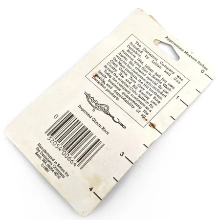 Нікельована конструкція 6-го номера забезпечує плавне обертання цих вертлюжків Danielson на кулькопідшипниках для різноманітних варіантів монтажу. Цей набір серії 2300SP під артикулом 19775 зберігся у невикористаному стані (6) в оригінальній роздрібній упаковці 1980-х років. Виготовлені в Кореї, вертлюжки мають надійну конструкцію із застібкою в поєднанні з високоякісними підшипниками для мінімізації перекручування волосіні. На вінтажній підкладці, де досі зберігся цінник Payless на суму $1.27, наведена коротка історія компанії Danielson, заснованої Ліліан та Гасом Даніельсонами у 1944 році. На звороті розміщена схема-інструкція з в'язання вузла «покращений клінч» та зручна дюймова лінійка для швидких замірів. Довжина вертлюжків становить приблизно 0,75 дюйма (1,9 см); вони представляють класичну фурнітуру, що постачалася з головного офісу в Кенті, штат Вашингтон.