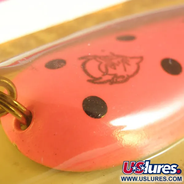 Помаранчево-чорне плямисте забарвлення вирізняє цю потужну коливалку вагою 21 г (3/4 унції). Ця приманка Eppinger Dardevle довжиною 7 см (2 3/4 дюйма) з артикулом 0517 пропонується у новому стані, в оригінальному червоно-білому блістерному пакуванні. На підкладці зазначено, що вона виготовлена компанією Eppinger MFG. у місті Дірборн, штат Мічиган, куди фірма переїхала у 1959 році. У центрі блешні чітко видно вибитий логотип «Голова Диявола» — фірмовий знак, невід’ємний від оригінальних розробок Лу Еппінгера 1906 року. Завдяки надійному трійнику та широкому ввігнутому профілю, приманка добре збалансована як для закидання, так і для тролінгу. Яскрава помаранчева фарба з контрастними чорними цятками — це характерне забарвлення з багатьох варіантів, розроблених компанією за її столітню історію. Кожна деталь, від фірмової вирубки країв до контрастного оформлення, відображає якість американських снастей тієї епохи.
