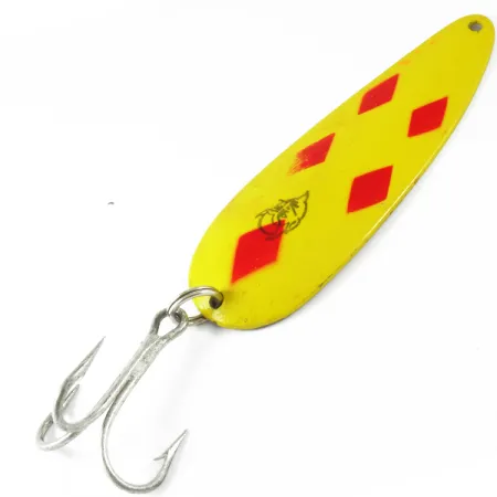 Жовте покриття з п'ятьма характерними червоними ромбами визначає це забарвлення, що є класикою для мисливців на щуку та маскінонга. Ця блешня-коливалка Eppinger Dardevle довжиною 9 см (3 1/2") та вагою 28 г (1 унція) з артикулом 3497 втілює дух інновацій із Детройта. На звороті ви знайдете фірмове клеймо, що вказує на походження з Детройта, США — деталь, яка відносить дизайн до раннього періоду виробництва компанії. Увігнутий металевий корпус створений для амплітудної гри під час рівномірної проводки. Лакофарбове покриття добре збереглося, поверхня чиста і має лише мінімальні сліди використання, що відповідає стану 4/5. Блешня оснащена потужним сріблястим трійником на заводному кільці, а на лицьовій стороні біля черевця помітний класичний логотип із головою диявола. Цей екземпляр демонструє фірмові матриці, які Eppinger використовує понад століття для збереження специфічної геометрії та розподілу ваги приманки.