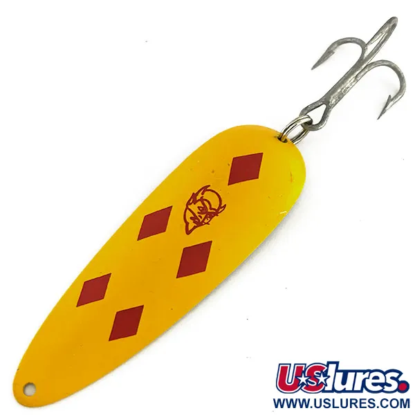 П’ять виразних червоних ромбів на класичному жовтому тлі цієї вінтажної коливалки дозволяють миттєво впізнати легендарне забарвлення «Five of Diamonds». При вазі в 1 унцію (28 г) та довжині 3 1/2 дюйма (9 см), цей екземпляр має характерне зображення голови диявола, нанесене безпосередньо на пофарбовану поверхню. Компанія Eppinger виготовляє ці блешні в Мічигані ще з часів перших кроків Лу Еппінгера в Детройті, і ця конкретна приманка під артикулом 9103 зберегла ту високу якість збірки, завдяки якій бренд став невід’ємною частиною рибальських коробок Північної Америки. На зворотному боці на металі викарбувано автентичний напис «Dardevle» та вагу, при цьому сама поверхня лишається винятково чистою. Блешня оснащена міцним трійником та надійним заводним кільцем, що робить її готовою до лову в закид або тролінгу таких великих хижаків, як щука чи маскінонг. Стан цього конкретного виробу відмінний, що відповідає впевненій оцінці 5/5. Довгаста форма та увігнутий профіль є характерними ознаками фірмових матриць, які використовує Eppinger, щоб кожен виріб відповідав історичним стандартам американських рибальських снастей.