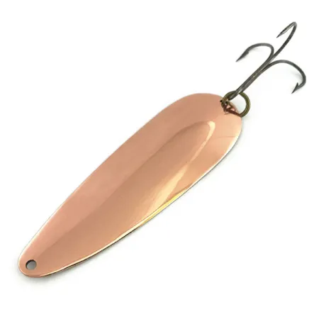 Довжиною 9 см (3 1/2 дюйма), ця класична коливалка має полірований мідний бік, що контрастує з нікельованою зворотною стороною. Знайти примірник у стані 5/5 — справжня знахідка для будь-якого колекціонера, адже поверхні зберегли блиск і не мають видимих слідів зносу. Клеймо на звороті — «DARDEVLE» DETROIT U.S.A. — свідчить про спадщину раннього виробництва Лу Еппінгера в Мічигані до переїзду компанії в Дірборн у 1959 році. Ця приманка (артикул 9425) має значну вагу 28 г (1 унція), розраховану на облов глибин під час закидання чи тролінгу. Її ввігнуте видовжене тіло оснащене надійним трійником на потужному заводному кільці, що демонструє якість оригінальних штампів американського виробництва. У той час як лицьова частина сяє теплим мідним тоном, нікельована спинка дає класичні відблиски для різних умов на воді, відповідно до принципів дизайну, закладених Еппінгером понад століття тому.