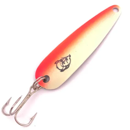 Ця вінтажна блешня завдовжки точно 6,5 см (2,5 дюйма) представляє ранню епоху виробництва компанії Eppinger у Детройті. При вазі 5 г (3/16 унції), модель Chuck-Lett 3400 UV вирізняється яскравим градієнтом: насичений флуоресцентний помаранчевий плавно переходить у кремовий колір корпусу. На лицьовому боці розміщено легендарний логотип у формі голови диявола — символ серії Dardevle, історія якої розпочалася в підвальній майстерні Лу Еппінгера ще у 1906 році. Зворотний бік — це полірована срібляста пластина з чітким клеймом «CHUCK-LETT DETROIT U.S.A. 3400», що підтверджує її походження до того, як компанія переїхала в Дірборн у 1959 році. Цей конкретний виріб з артикулом 3938 не був у використанні, зберіг свій первісний блиск і гострий трійник. Хоча багато блешень Dardevle були відомі тим, що через свою надійність входили до авіаційних комплектів виживання, цей екземпляр призначався саме для тролінгу. Увігнута довгаста форма забезпечує виразну гру в товщі води під час рівномірної проводки.