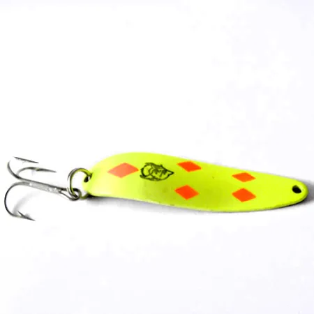 Ця блешня Eppinger Dardevle Cop-E-Cat вагою 1/2 унції (14 г) має легендарний візерунок із п'яти червоних ромбів на яскравому флуоресцентному зеленому фоні. При довжині 2 1/2 дюйма (6,5 см) на приманці розміщено впізнаваний логотип «Devil» по центру — фірмовий знак спадщини Лу Еппінгера, що бере свій початок у Детройті ще з 1906 року. Оснащення складається з міцного заводного кільця та гострого трійника, що підходить для класичного закидання або тролінгу. Покриття цього конкретного примірника під артикулом 0165 залишається яскравим і забезпечує добру помітність у воді за різних умов. Її увігнута поверхня розроблена для створення характерної коливальної гри під час рівномірної проводки. Виготовлений у США за допомогою фірмових штампів, металевий корпус має незначні косметичні сліди часу, що відповідає стані на 4/5.