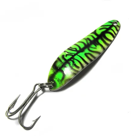 Яскраві неоново-зелені акценти цієї блешні-коливалки вагою 1/3 унції (10 г) контрастують із темним сегментованим візерунком. Ця блешня Dardevle Cop-E-Cat 7300 завдовжки 2 1/4 дюйма (5,5 см) має характерну видовжену форму та увігнуту штамповану поверхню, завдяки яким компанія Eppinger стала відомою кожному американському рибалці. У моделі з артикулом 0411 використовується висококонтрастне забарвлення, що дозволяє приманці залишатися помітною за будь-якої прозорості води. Компанія Eppinger виготовляє такі приманки у США з 1906 року; у 1959 році виробництво перенесли до Дірборна, штат Мічиган, де на фірмових штампах і досі відтворюють цей класичний силует. Стан приманки оцінюється на впевнені 4 з 5: яскраве покриття та металева фурнітура мають лише незначні сліди використання. Трійник сріблястого кольору надійно закріплений за допомогою міцного заводного кільця в нижній частині блешні. Геометрія блешні забезпечує стабільну гру з характерним розгойдуванням під час повільної проводки, що є візитною карткою цього виробника з понад столітньою історією.