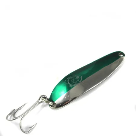 Поверхня цієї середньорозмірної коливної блешні розділена на нікелеву та напівпрозору зелену частини — це класичне поєднання кольорів із каталогу Eppinger. При довжині рівно 5,5 см (2 1/4 дюйма), ця модель Dardevle Cop-E-Cat 7300 (код товару 0424) має фірмове клеймо з головою диявола, частково нанесене поверх зеленого покриття. На зворотному боці чітко видно штамп «COP-E-CAT 7300 DETROIT USA», що вказує на походження приманки ще до переїзду компанії в Дірборн у 1959 році. Завдяки вазі 10 г (1/3 унції), вона є універсальним вибором для лову прісноводних видів риб як узакид, так і тролінгом. Оснащення включає міцний трійник, закріплений заводним кільцем у хвостовій частині. Стан блешні оцінюється на 4 з 5: вона зберегла чисту дзеркальну поверхню як на нікельованій, так і на кольоровій частинах. Ця приманка американського виробництва демонструє особливості виробничих штампів, які компанія Eppinger використовувала для становлення своєї репутації в Детройті.