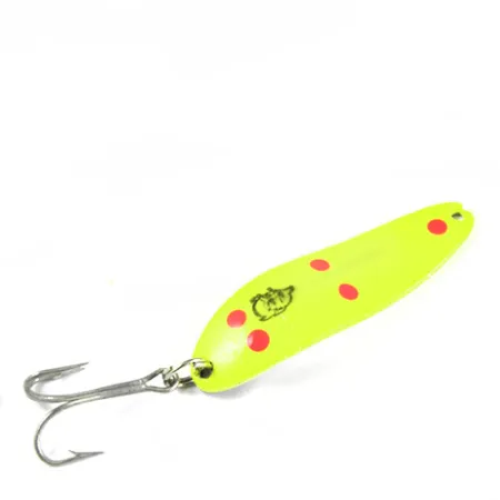 Полірований метал на зворотному боці має клеймо «COP-E-CAT 7300 DETROIT USA», що свідчить про те, що це ранній виріб Eppinger, виготовлений ще до переїзду фабрики в Дірборн у 1959 році. На опуклому боці яскраво-жовта основа доповнена п'ятьма червоними точками та впізнаваним логотипом у формі голови диявола. Ця коливна блешня вагою 1/3 унції (10 г) має довжину 2 1/4 дюйма (5,5 см), що забезпечує виразний профіль для лову різних видів прісноводних риб. Фарбове покриття моделі з артикулом 0425 збереглося у відмінному стані — гладка поверхня без жодного сколу відповідає оцінці 5/5. Оснащення включає надійне заводне кільце та гострий трійник, що свідчить про дбайливе зберігання приманки протягом багатьох років. Такі довгасті блешні виготовляються за допомогою фірмових штампів, що гарантує стабільну гру з характерним перевалюванням під час проведення або тролінгу. Контраст яскраво-жовтого кольору з червоними точками забезпечує добру помітність, а срібляста спинка створює привабливий металевий відблиск.