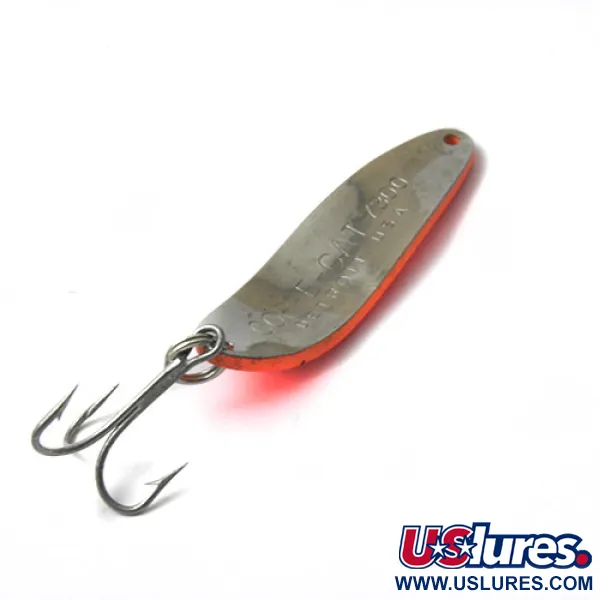 Шість виразних чорних цяток нанесені на яскраво-помаранчеве покриття цієї класичної американської коливалки. При вазі 14 г (1/2 унції) та довжині 5,5 см (2 1/4 дюйма), ця Eppinger Dardevle Cop-E-Cat 7300 має культовий логотип «Голова Диявола», що є візитівкою цих мічиганських приманок вже понад століття. Червоно-помаранчеве забарвлення створює чіткий контрастний силует, а штампований металевий корпус розроблений для універсального використання — як для закидання, так і для тролінгу. Модель під артикулом 0449 оснащена міцним трійником та надійним заводним кільцем. Даний екземпляр зберігся у стані 4/5, що свідчить про довговічність оригінальних стандартів виробництва Лу Еппінгера. Увігнута внутрішня поверхня створює необхідний опір воді, що забезпечує її фірмову гру в товщі води.