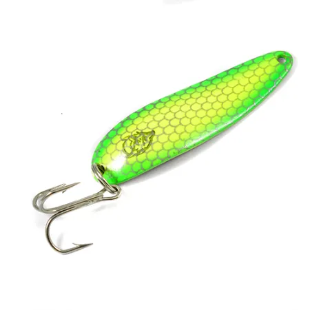 Маючи вагу 1/2 унції (14 г), ця коливальна блешня вирізняється яскравим лимонно-жовтим стільниковим візерунком луски на лицьовій стороні. На штампованому нікельованому реверсі чітко видно маркування «COP-E-CAT 7400» та «DETROIT U.S.A.», що пов’язує цей примірник з історією виробництва компанії Eppinger у Мічигані до її переїзду в Дірборн у 1959 році. При довжині 2 1/2 дюйми (6,5 см) блешня має класичну увігнуту форму Dardevle, розраховану на характерну коливальну гру під час проведення або тролінгу. Цей товар має артикул 2094 та стан 5/5, зберігаючи стійкий глянцевий блиск і чистий сріблястий трійник. Контраст між яскравою лимонною лускою та полірованою нікельованою спинкою створює візуальний профіль, придатний для різних умов на водоймі. Металевий корпус виготовлений за допомогою тих самих якісних матриць, що використовуються для виробництва цих приманок уже понад століття. Надійне заводне кільце міцно фіксує оснащення у хвостовій частині.