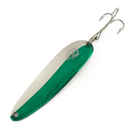 Виразний діагональний поділ полірованого нікелю та напівпрозорого зеленого кольору визначає зовнішній вигляд цього екземпляра. При вазі 1/2 унції (14 г) ця Eppinger Dardevle Cop-E-Cat 7400 є класичним представником рибальської спадщини Детройта. На зворотному боці блешні чітко видно викарбуване маркування «COP-E-CAT 7400» та «DETROIT U.S.A.», що підкреслює історію бренду та його мічиганське коріння. При довжині 2 1/2 дюйма (6,5 см) приманка має впізнаваний логотип у вигляді голови диявола, вигравіюваний на зеленому боці металу. Міцний трійник надійно закріплений за допомогою заводного кільця у хвостовій частині, що робить блешню придатною як для лову в закид, так і для тролінгу. Цей конкретний примірник під кодом товару 8392 має оцінку стану 5/5, зберігаючи чисті поверхні та яскравий блиск, характерні для добре збереженого колекційного предмета. Увігнута форма тіла є візитівкою конструкторської філософії Eppinger, яка зародилася в підвалі Лу Еппінгера у 1906 році.