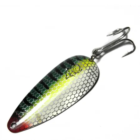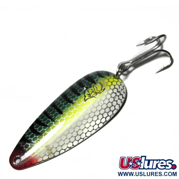 Вагою 21 г (3/4 унції), ця блешня Eppinger Dardevlet є справжньою класикою американського рибальства з Дірборна, штат Мічиган. Корпус довжиною 7,5 см (3") має яскраве забарвлення під окуня: темні вертикальні смуги на фоні жовто-зеленого градієнта, що переходить у світловідбивний візерунок «бджолині стільники» на нижній частині. Невелика червона мітка біля вушка додає традиційного контрастного акценту. На звороті золотистої увігнутої пелюстки чітко викарбовано назву DARDEVLET та вагу приманки, що свідчить про високу якість штампів, які компанія Лу Еппінгера використовує ще з початку XX століття. Оснащення складається з міцного металевого трійника, закріпленого на потужному заводному кільці. Стан цього конкретного екземпляра оцінюється на 4/5: фарба добре збереглася, а маркування залишилося чітким. Завдяки своїй впізнаваній довгастій формі приманка має ту саму фірмову гру, яка зробила ці «коливалки» обов’язковим елементом авіаційних наборів для виживання у воєнні часи. Ця блешня з артикулом 0262 залишається підтвердженням багаторічного успіху бренду на водоймах.